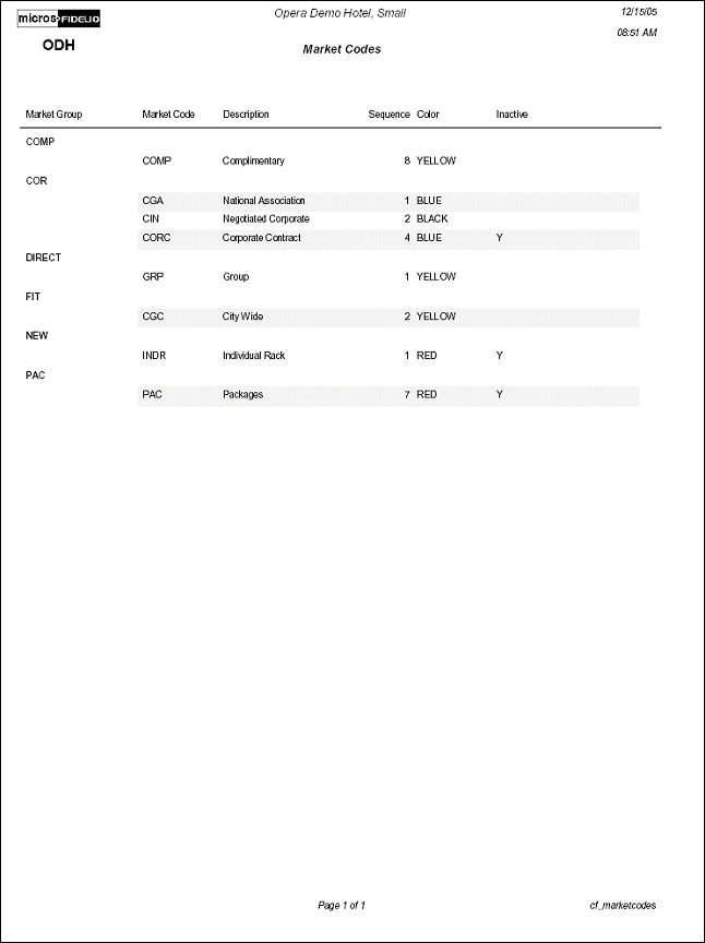 The Configuration report for Market Codes will display all Market Codes that have been configured in the application. When the OPP_MHOT Opera Property Management Multi Property Base add-on license code is active, this report will represent Market Codes for the selected Property only.