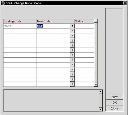 New. Opens a multi-select list of market codes to choose either the existing market codes or the new codes to be updated to.