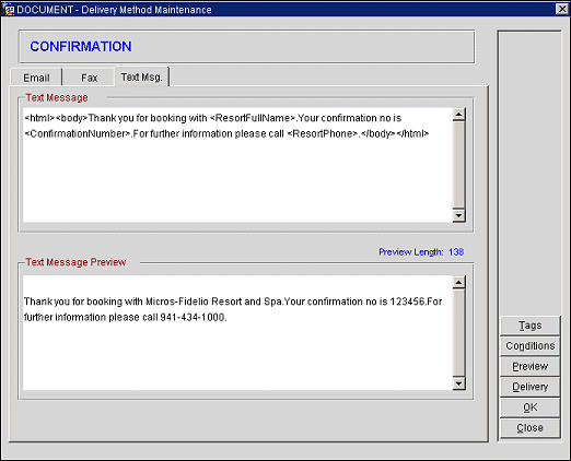 Text messaging may be set up for confirmation letters, messages, queue reservations notifications, queue rush notifications, and electronic vouchers. To configure the delivery method, tags, and conditions for sending confirmations, messages, queue reservations, and queue rush via Text, select Configuration > Property > Delivery Methods > Confirmations or Messages, Queue Rooms > Queue Reservations, or Queue Rooms > Queue Rush. This opens the Delivery Method Maintenance screen.