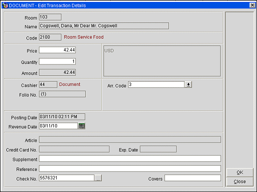 Cashier. View-only. The number of the cashier who entered the transaction, followed by the cashier's name. Some automatic postings such as fixed charges (e.g., room and tax) and telephone charges might not include a cashier number.