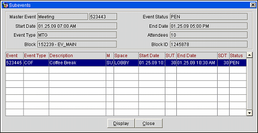 To access the Event Display screen, select Show All from the Function Diary's right-click functions or OB Events (Overbooked) from the Function Diary screen's buttons. Select Display to open the Event screen or Close to go back to the Function Diary.