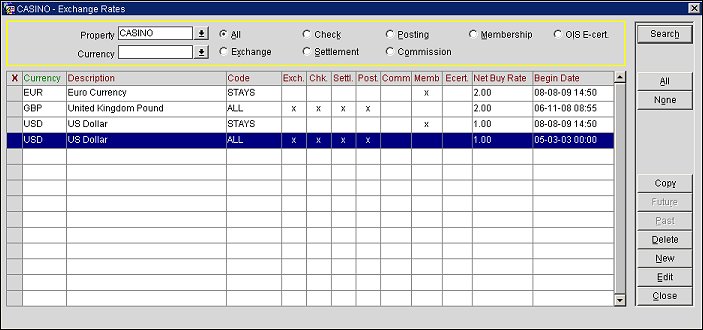 In addition to being time sensitive, specific currency exchange rates can be associated with each major purpose, or usage, of the currency exchange. For example, when the exchange is part of a posting, the currency exchange rate might be different from the exchange rate when the exchange is being handled in payment of travel agent commissions. Or, in another example, the exchange rate for cashing a guest's traveler's check into the local currency, might change each day or on a certain day each week.
