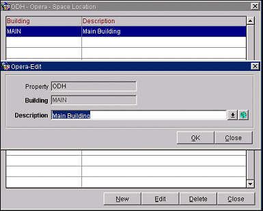 You may access this screen by selecting System Configuration>Reservations>Function Space Classifications>Function Space Location when the OPS<version number> OPERA S&C license is active. The OPERA space Location screen appears.
