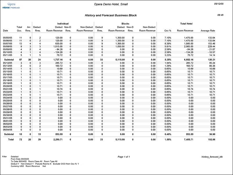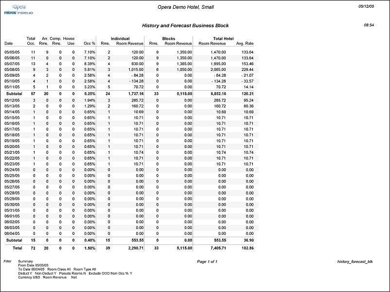 The History and Forecast Business Block Report gives you a clear picture of past reservation activity as well as what reservations are anticipated into the future, broken down into Individual versus Block Business. The report output is divided into Statistical data and Forecast data.  The output will match that of the history_forecast.rep with a further additional breakdown of Revenues and Rooms.