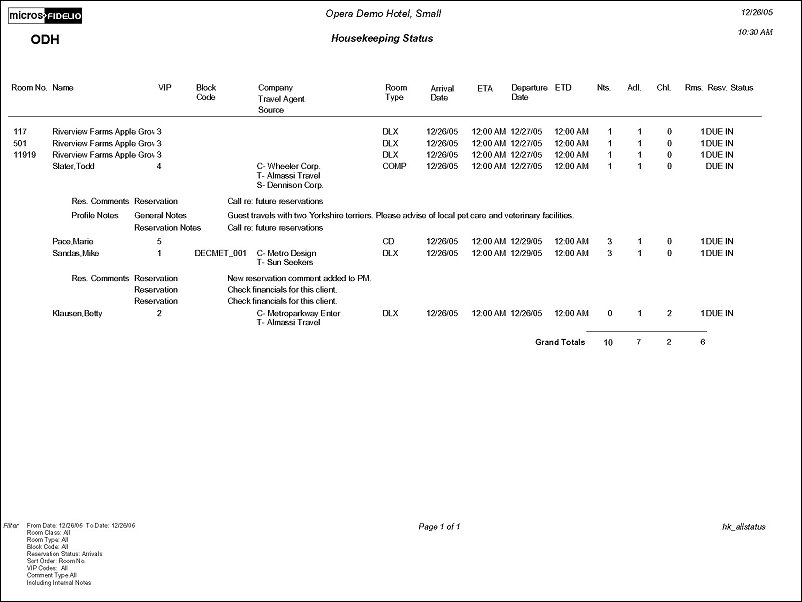 Arrivals. Displays the housekeeping status for the rooms with reservations that will be arriving for the selected date range.