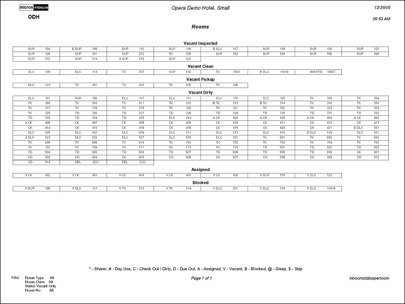 The House Status Per Room Report displays all of your property's rooms. Print this report to see a list of all rooms and their housekeeping status. You have the ability to filter on Occupied or Vacant Rooms or print for all rooms by selecting both check boxes.