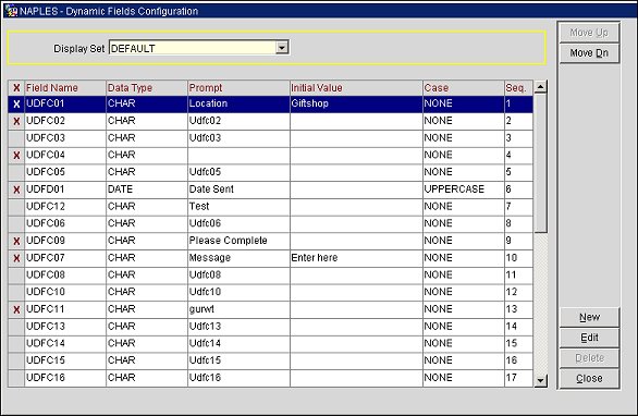 If you want to edit or add fields to an existing Display Set, select the Display Set from the LOV. The display set fields will display in the grid. (You can create a new Display Set by selecting the New button. See Creating a New Display Set.)