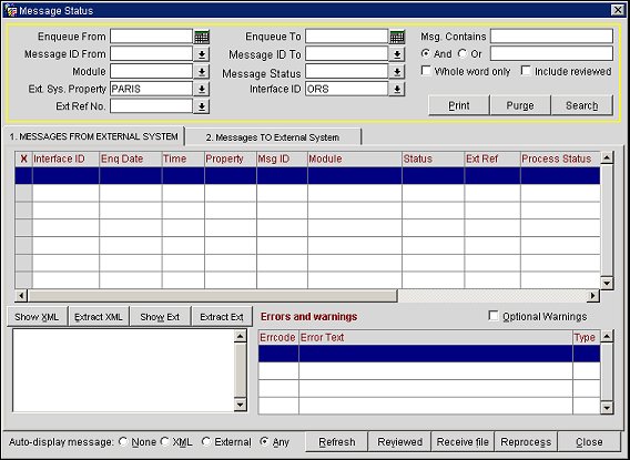 Note: The lower part of the Messages from External System is split into a Show XML/Show Ext for the messages and a part for Errors and Warnings. The Show XML/Show Ext allows viewing of the original external system format and the XML message format. The Errors and Warnings shows details of all errors and warnings that have occurred during message transmission.