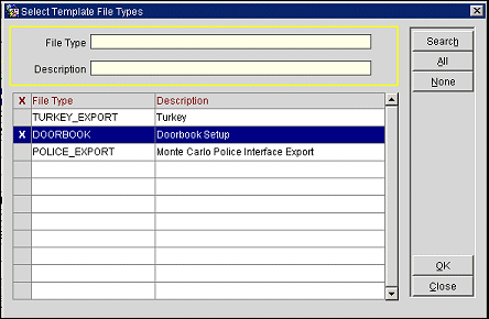 To set up the Doorbook layout, select Miscellaneous > File Export > Country or Configuration > Exports, Country Exports. The Export File List screen appears. Select the New button and from the list of templates select DOORBOOK.