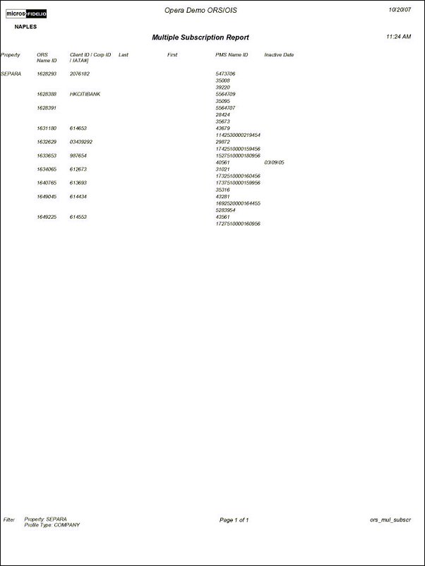 The Multiple Subscription report identifies the profiles which have multiple subscriptions, such as one ACTIVE and one INACTIVE for the same property.  This gives the PMS users the information to perform the merge properly on PMS and ultimately delete the INACTIVE subscription in ORS.