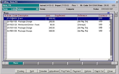 In this example, upon check-in the system generated the internal package credit for $20.00 being for champagne consumption. The butler forgot to take the bottle to the room so the property made a package profit. The system posted $20.00 to package debit to show this.