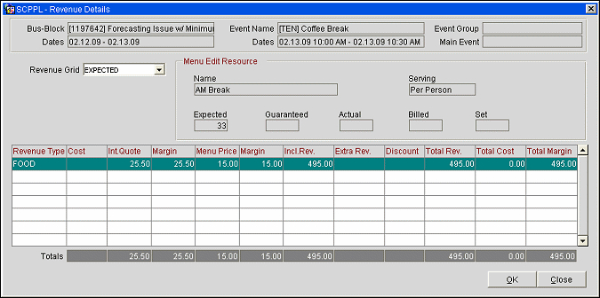The Revenue Details grid can be accessed through the Details button from the Edit Menu screen. Four different grids are available to view. Expected revenue, guaranteed revenue, actual revenue and billed revenue. It is possible to switch between these grids by selecting the appropriate grid from the revenue grid LOV. From here all details on these grids are VIEW ONLY. The total line displays the sum for all revenue types for each column.