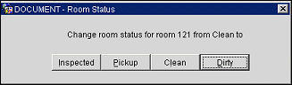Note: The Inspected status is available if the Rooms Management>Inspected Status application function is set to Y. The Pickup status is available if the Rooms Management>Pickup Status application function is set to Y.