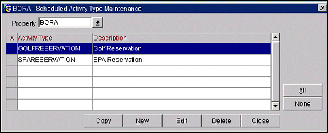 To copy activity types to other properties, select the activity type codes you want to copy by clicking in the X column to mark your choices (you may also use the All and None buttons). The select the Copy button. The Properties LOV appears. Choose the properties to copy activity types to and select the OK button.