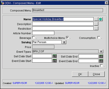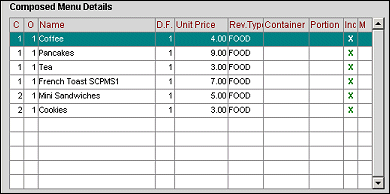 Once selected, these Menu Items will display in the Composed Menu Details grid. They will all have Course = 1 and Order = 1.