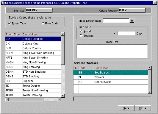 , select the Trace Department that shall apply for that room type or rate code formerly selectedNote: The OXI Reservation Parameter SPECIALS_EXT_SYS_OVER will affect how the special request codes are attached to the reservations.