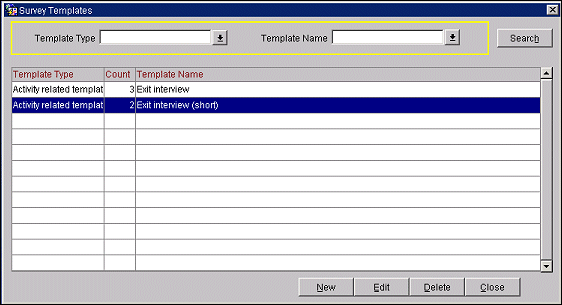 The Survey Templates screen shows a list of the templates you have already set up. It also allows you to edit templates and create new ones.