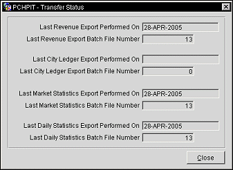 OPERA displays the date the last export was carried out for each transfer type and the batch file number if applicable. If you are running in Batch Transfer mode, the above screen displays only the date the last batch transfer was performed and the file number since activating the Back Office Interface.