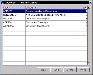 The Travel Agent Types screen displays the following information.