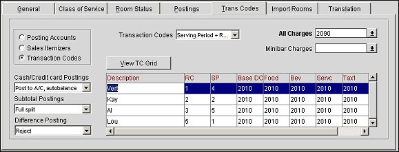 Transaction Codes. This allows you to configure the different methods for routing a charge to the different transaction codes configured in OPERA. If you select a different value, OPERA displays a message informing you that current transaction code settings will be deleted. Select the Yes button to continue. Changing this value will alter the appearance of the grid.