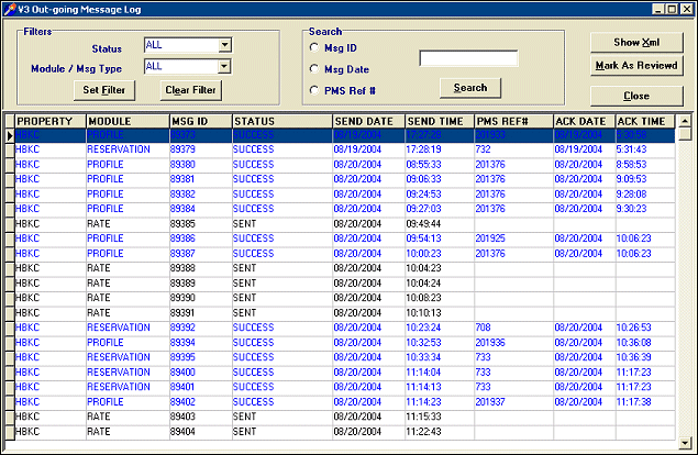 Show XML. For any highlighted message you can display the XML message format. It will display from an I.E. Browser window. Users can utilize this to see what data was sent on that message and if the Profile, Reservation, Rate etc needs to be manually resent from the Fidelio V6 side again.